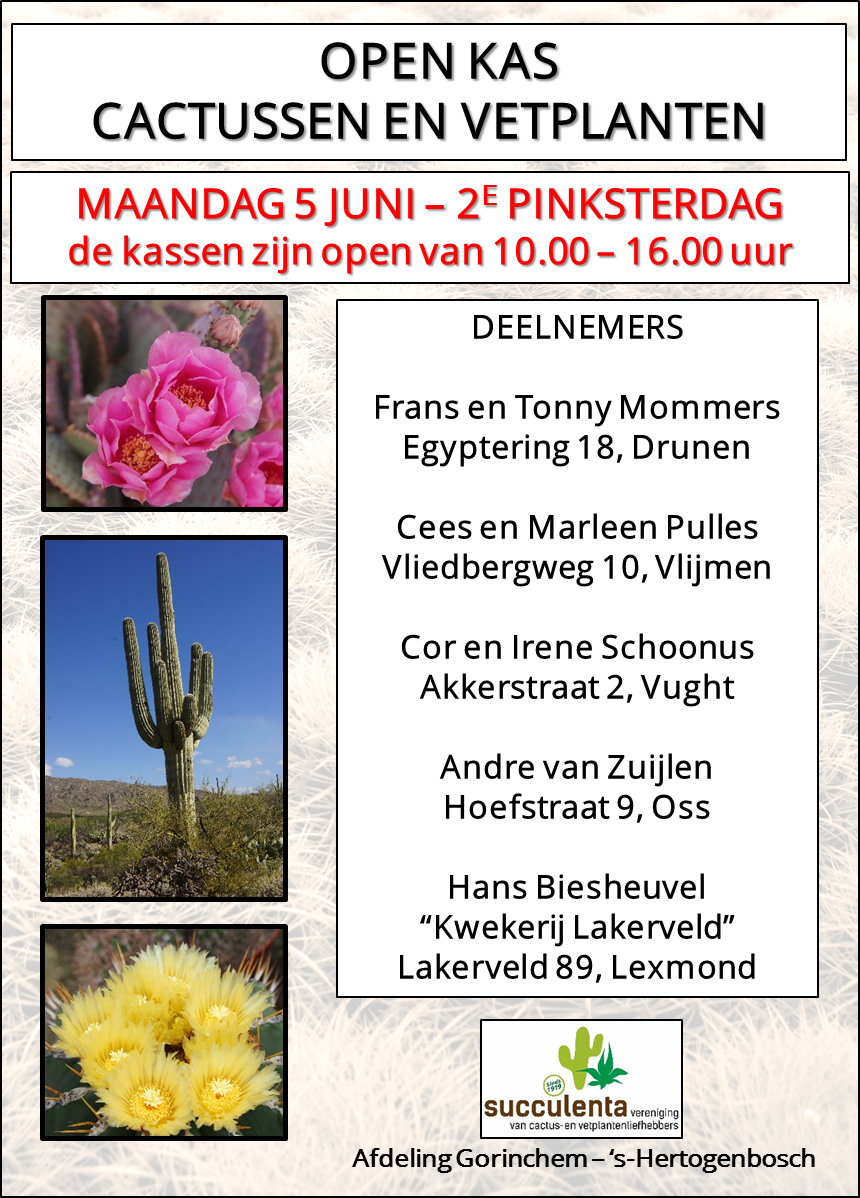 Op maandag 5 juni, 2e Pinksterdag, wordt van 10.00 tot 16.00 uur door 5 leden van de afdeling Gorinchem – ’s Hertogenbosch open kas gehouden.