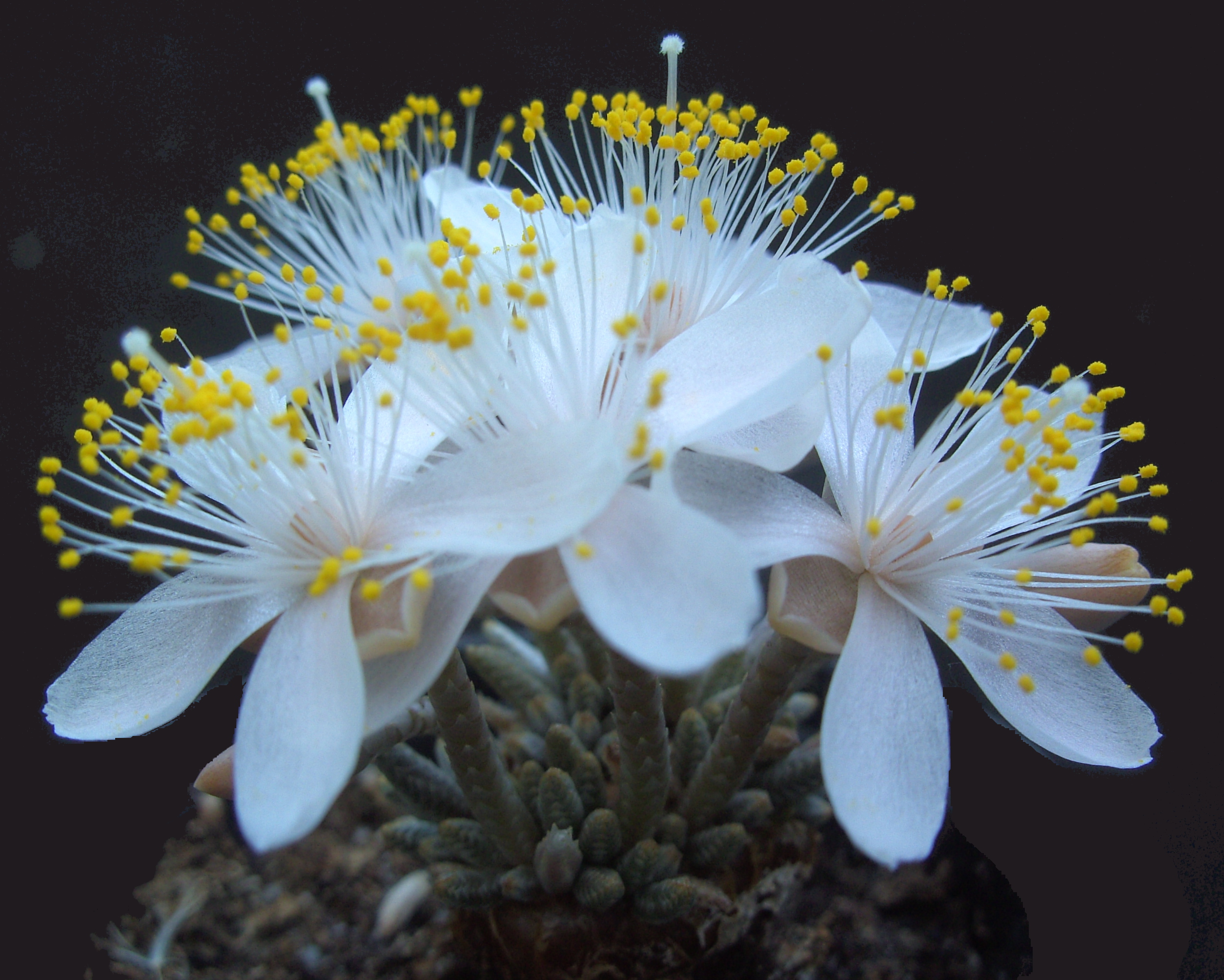 Je komt deze soort vaker tegen onder de naam Avonia alstonii en ook nog onder de naam Anacampsereos alstonii. Jaren geleden had ik bij de Engelse firma Southwest Seeds 100 zaden van deze soort besteld. Het bleken er veel meer te zijn en ze kwamen ook nog eens heel goed op. Na het verspenen had ik er een bakje vol mee. Liefhebbers die bij mij op bezoek komen, ontgaat een dergelijk bakje vrijwel nooit. Zelfs toen ze nog niet eens in bloei stonden kwam er steevast de vraag of ik er niet een paar kan missen. Een plant die in bloei komt is al helemaal een blikvanger. Bovenop de luciferdunne, witgeschubde stengeltjes ontvouwen zich de simpel gebouwde maar wonderschone en naar verhouding enorm grote bloemen. Boven de vijf breed uitstaande, teer wit doorschijnende bloemblaadjes steekt een flink aantal (60 tot 80!) even tere meeldraden uit, waarop de gele helmknoppen vervaarlijk balanceren. Daarboven torent dan nog de pluizig behaarde stempel. Omdat zowel stamper als stempel wit zijn vallen zij nauwelijks op temidden van het gele geweld van de helmknoppen. Een klein plantje kan wel een stuk of 8 bloemen tegelijk torsen. De bloemen gaan op het eind van de middag open en ’s avonds weer dicht en dat een paar dagen achter elkaar. Opvallend is dat de planten allemaal tegelijk in bloei staan. Dat verschijnsel doet zich in iets mindere mate ook voor bij Astrophytum en Frailea. Als het een tijdje regenachtig weer is zoals nu, half juni 2016 dan openen de knoppen zich helemaal niet.