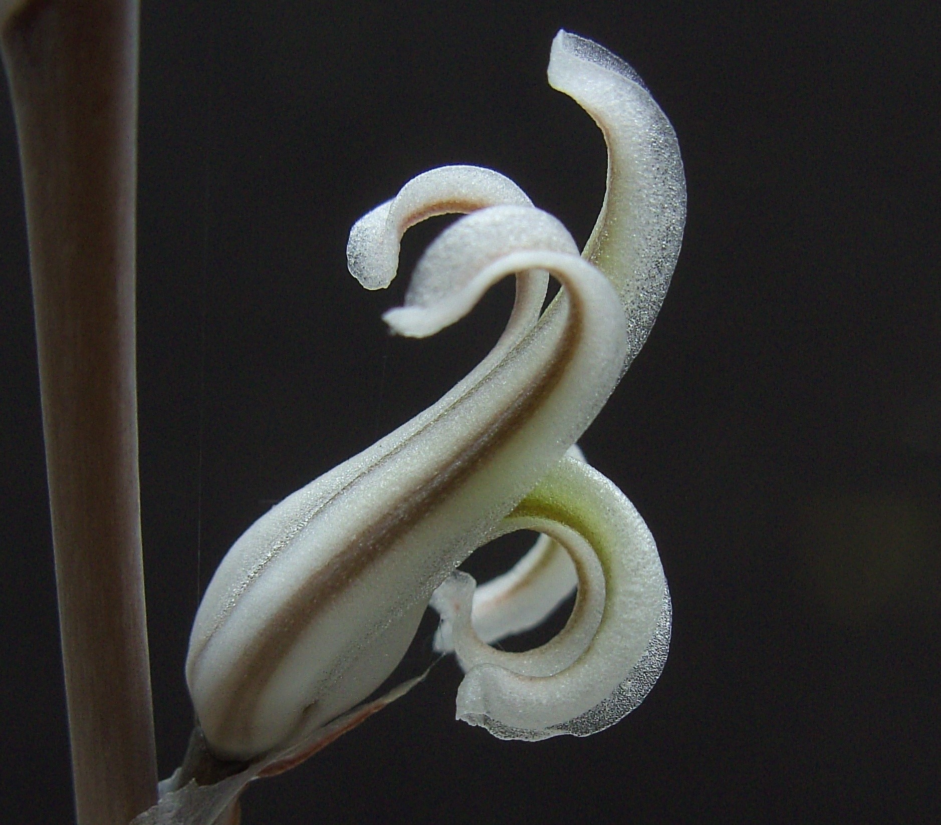 Hoe anders wordt het als je één van die bloempjes in close-up bekijkt. De bloemblaadjes van Haworthia truncata lopen uit in tere, sierlijk krullende, transparante slippen. Het geheel doet denken aan een majestueuze zwaan.
