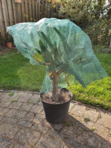 “ik heb ’s winters een paar Aloes binnen staan. De eerste staat nu weer buiten: Aloe plicatilis. Om verbranding te voorkomen dek ik deze de eerste tijd af met schaduwgaas. Na een tijdje en met wat bewolkt weer gaat dit schaduwgaas er pas af.”