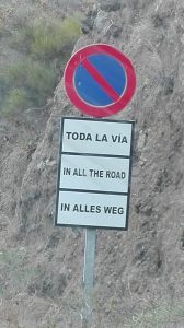 Je komt in de Barranco de los Angustias door vanuit de stad Los Llanos een smalle en zeer bochtige weg te volgen. Het vergt behoorlijk wat manoeuvreerwerk om een tegenligger te passeren. Parkeren langs de weg is dan natuurlijk helemaal uit den boze. Aan het begin van de weg staat daarom een verbodsbord. De Spaanse tekst “Toda la via” betekent “langs de hele weg”. Om te voorkomen dat domme Hollanders misschien denken dat het zoiets betekent als “vier het leven”, hebben ze het maar vertaald (zie de foto). Maar ik betwijfel of het er begrijpelijker van wordt.