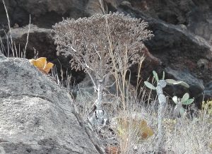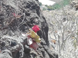 In september 2019 waren mijn echtgenote Loes en ik op La Palma. Dat was al voor de vierde keer. En dan moeten we natuurlijk mijn lievelingsplant, Aeonium nobile zien, de enige roodbloeiende aeonium. Deze groeit onder andere in de Barranco de los Angustias (de kloof van de angsten) en in de buurt van El Time, hoog tegen de wand van dezelfde kloof en in de volle zon.
