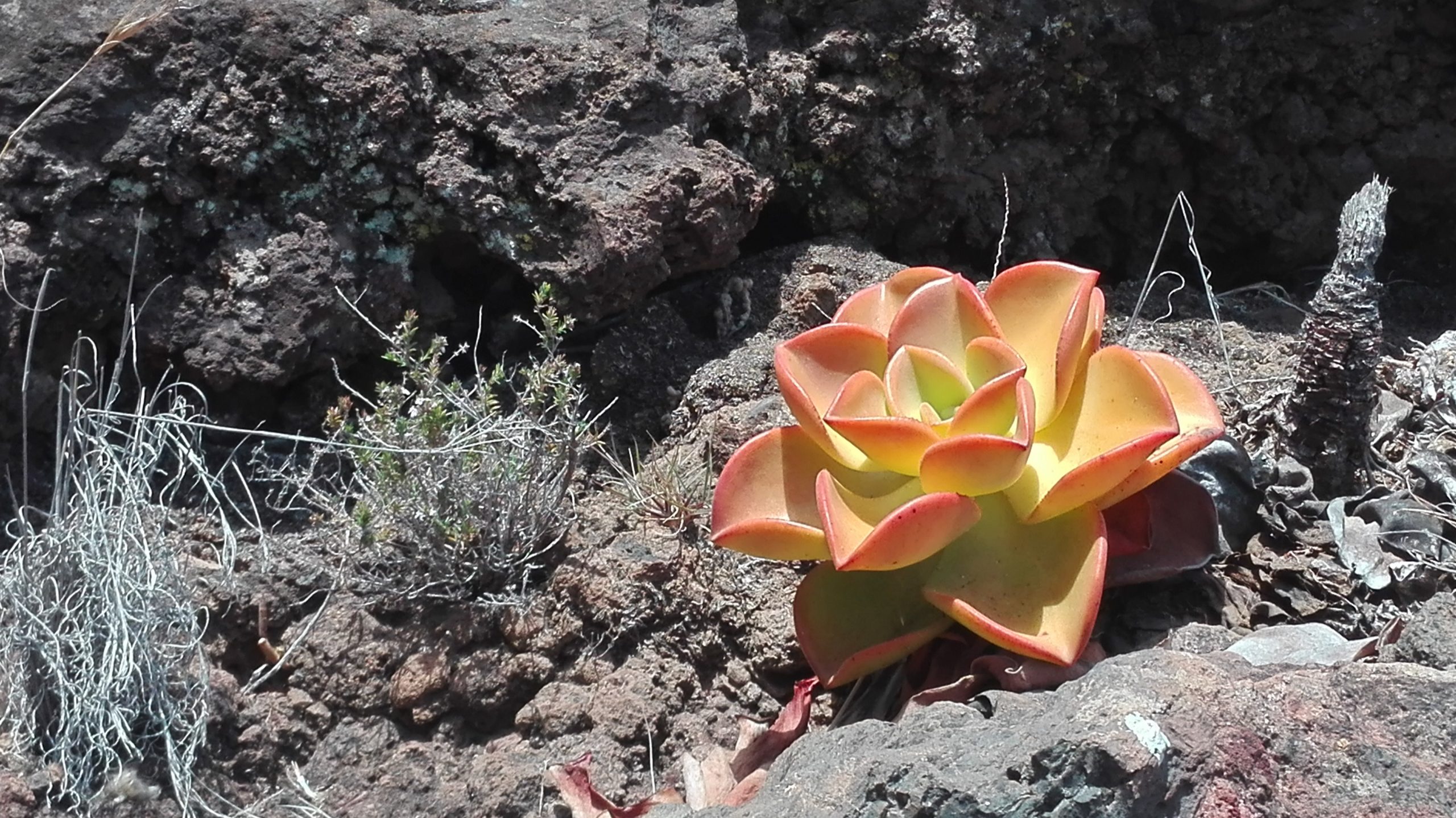 Op La Palma was het bijzonder droog. Heel veel planten, waaronder veel aeoniums zagen er volkomen verdord uit. Maar A. nobile met zijn dikke, bijzonder succulente bladeren zag er op veel plaatsen nog redelijk uit. Wel vaak rood tot goudgeel verkleurd, maar dat maakt dat de plant, zeker in de zon, er gewoon uit knalt. Hoewel de soort in juni-juli bloeit, vond ik ook nu nog een bloeiend exemplaar. Deze plant was nog aan de kleine kant. Waarom hij dan toch ging bloeien is mij niet duidelijk.